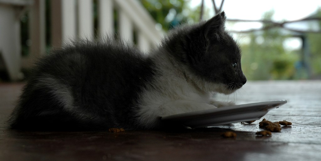 “AAAHHH. You’re the mean Thing!  Oh no.! Don’t touch my stuff!                                             Mine! Mine!”   (baby hiss, baby roar, baby cat expletives,  etc)” I showed that Thing. (munch  fast)  I Learned him.  Bad Thing. Bad, Bad Thing. I am just a wee kitty. (munch much faster)  An orphan! I hate that thing. (mumble mumble mouth full) That was the Mean Thing Two.  White cat told me about that Mean Thing Two.” (munch much much faster until popular processed cat food treat all  gone).