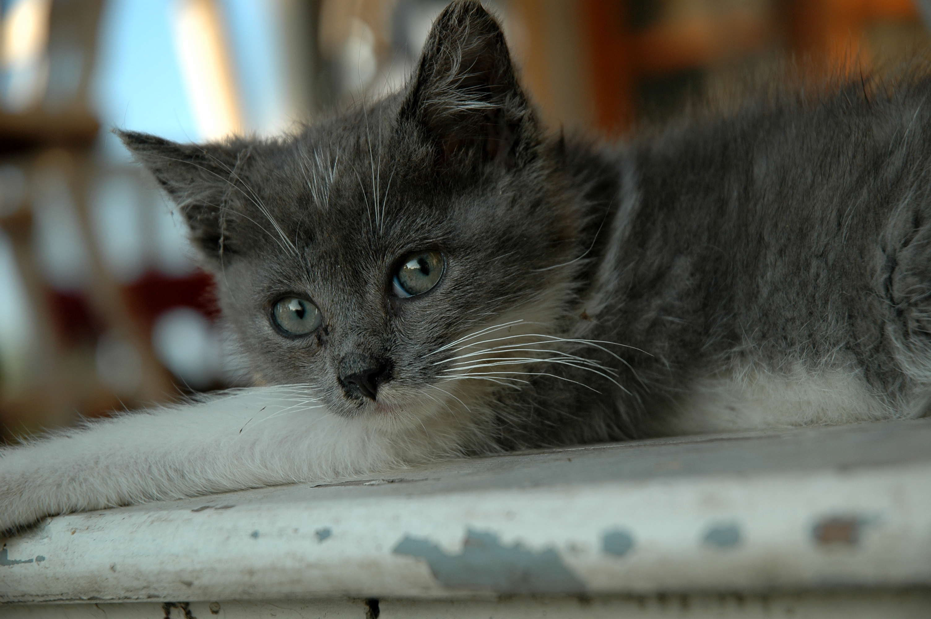 Your Kitty has been named. Her name is Mary’s Cat.  We know a little more of her story now after talking to the neighbours. So a few days ago this fellow and his wife were working on their house over a mile away as the crow flies,  and this wee bundle of misty fur wobbled up their drive and presented itself at their feet. They were leaving for Texas in a few hours  (they will be away for two weeks) so they gave it a bit of their lunch and then went back to shutting everything up and could not find it again.  So they left.