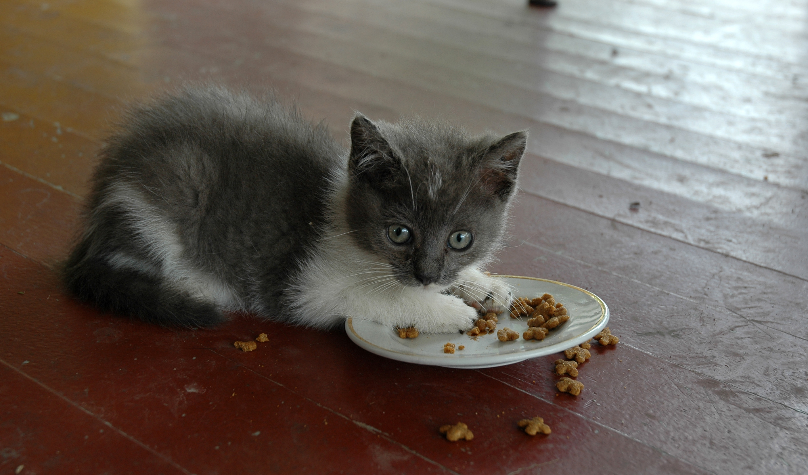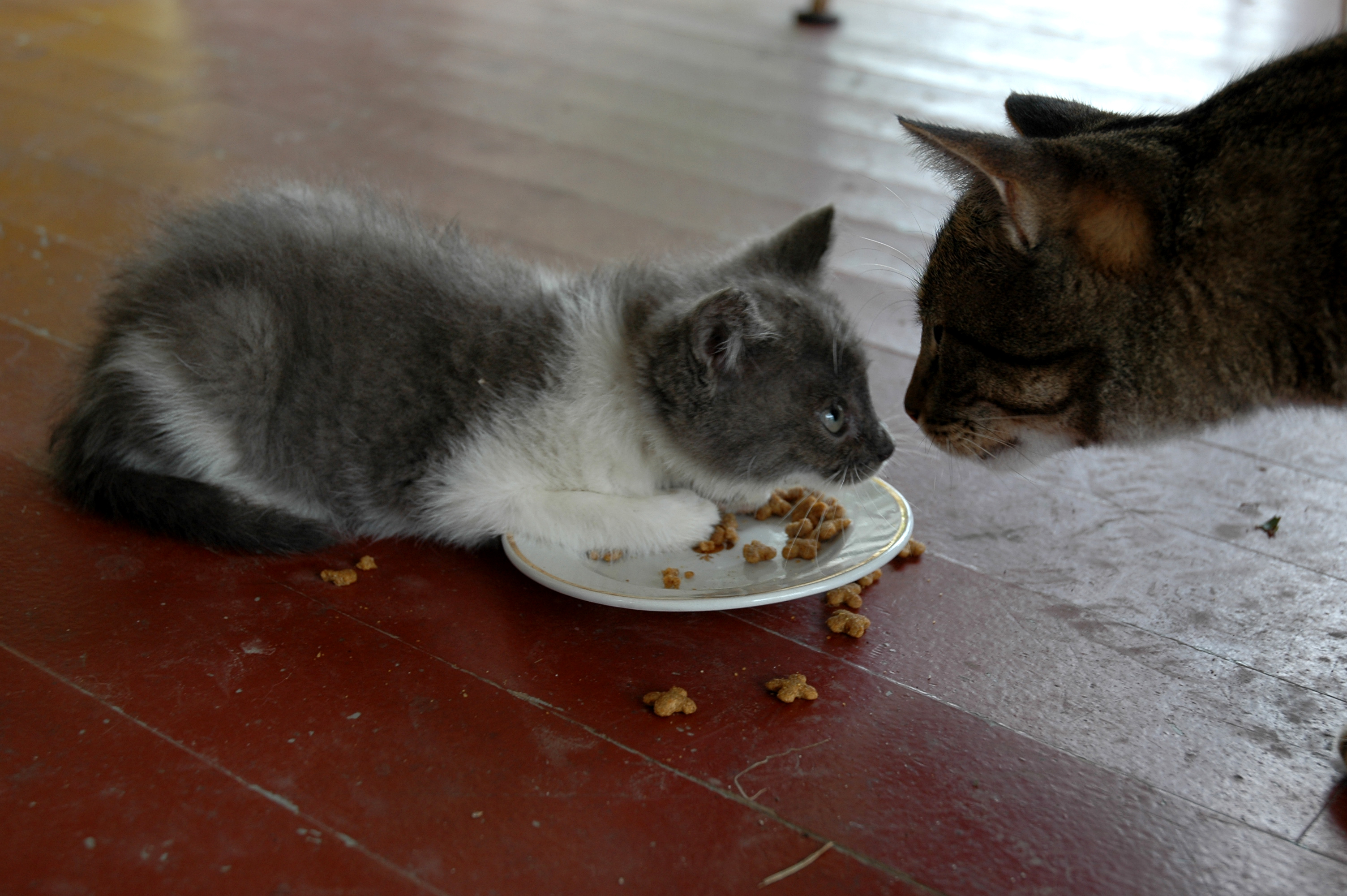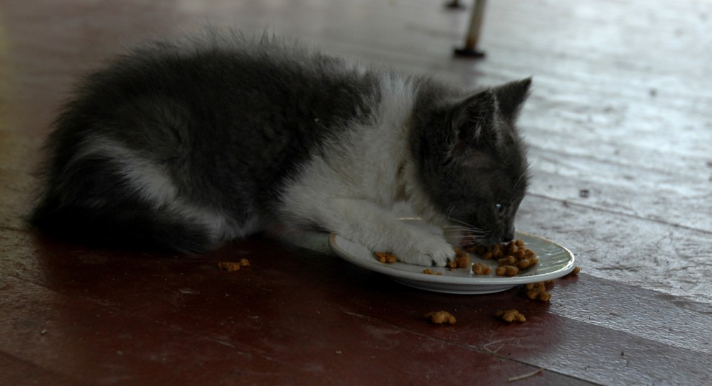 “AAAHHH. You’re the mean Thing!  Oh no.! Don’t touch my stuff!                                             Mine! Mine!”   (baby hiss, baby roar, baby cat expletives,  etc)” I showed that Thing. (munch  fast)  I Learned him.  Bad Thing. Bad, Bad Thing. I am just a wee kitty. (munch much faster)  An orphan! I hate that thing. (mumble mumble mouth full) That was the Mean Thing Two.  White cat told me about that Mean Thing Two.” (munch much much faster until popular processed cat food treat all  gone).