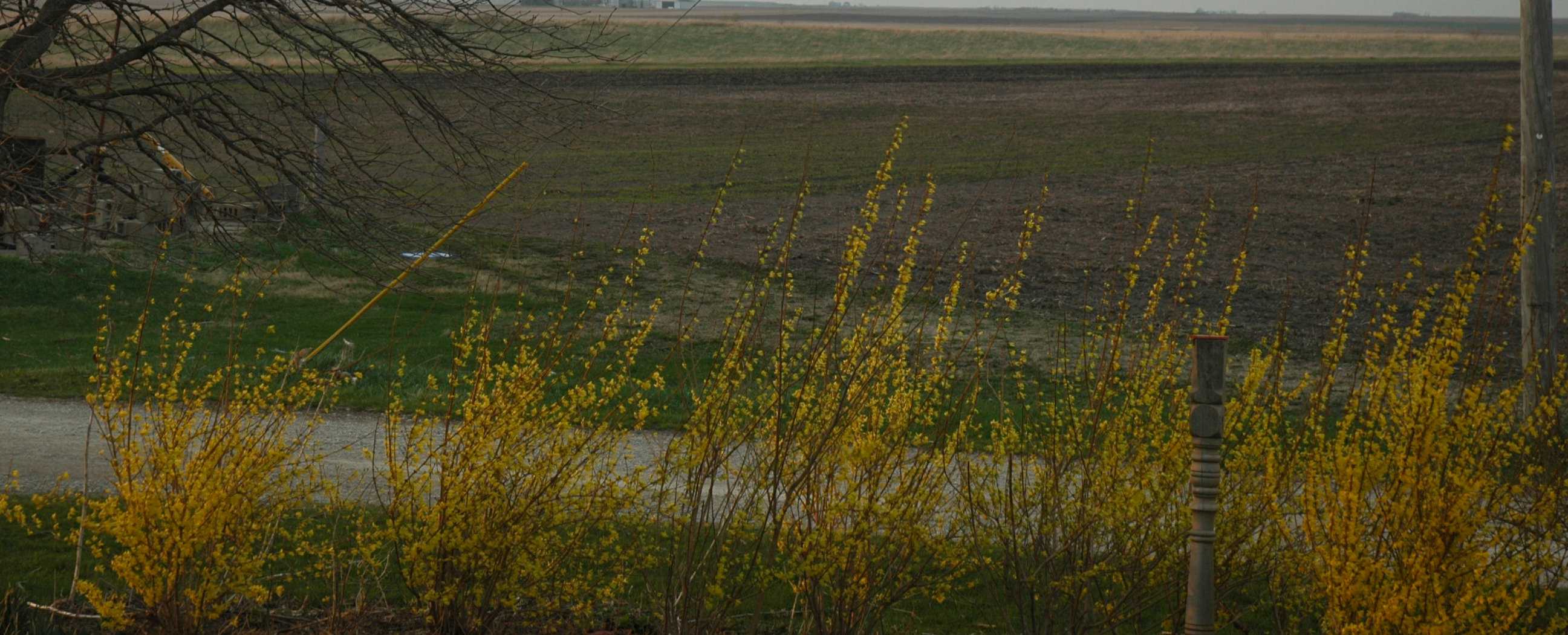 Forsythia. Very early spring. Comes out at around the same time as pussy willow so is a good staple. Prune after it flowers and it will flower from the new growth next year. You can dig up and tear the roots apart quite rudely to propagate. It is very hardy. This is an early spring shot. You can just see the new meadow beginning to sprout.