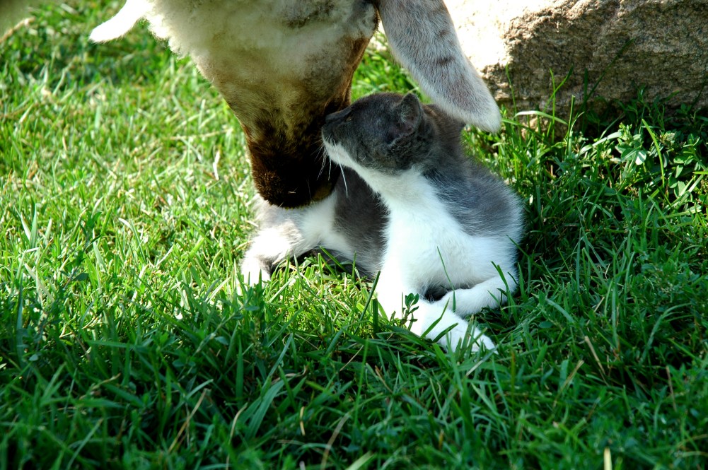 Oh Miss c. Have you got a sore foot? Oh let me see, oh no poor you, was it that big fat cow? oo sorry my little hoofys are a bit sharp, they’re just new, sorry, sorry. I can keep up with you, you know, because I am a big lambie. I will help you feed the chicks. OO Miss c is that Marys Cat? Hi Marys Cat. You walked all this way by your little self. On those little furry feet? Why don’t you have a real name Mary’s Cat, like me. I am Mia, can you say Mia? Ow WAAA. Miss c they did it again. They snuck up on me and head bashed me again. She’ll chop you UP!! WAA. Ya wanna come here and say that! Come on then. Lets see what ya got!.
