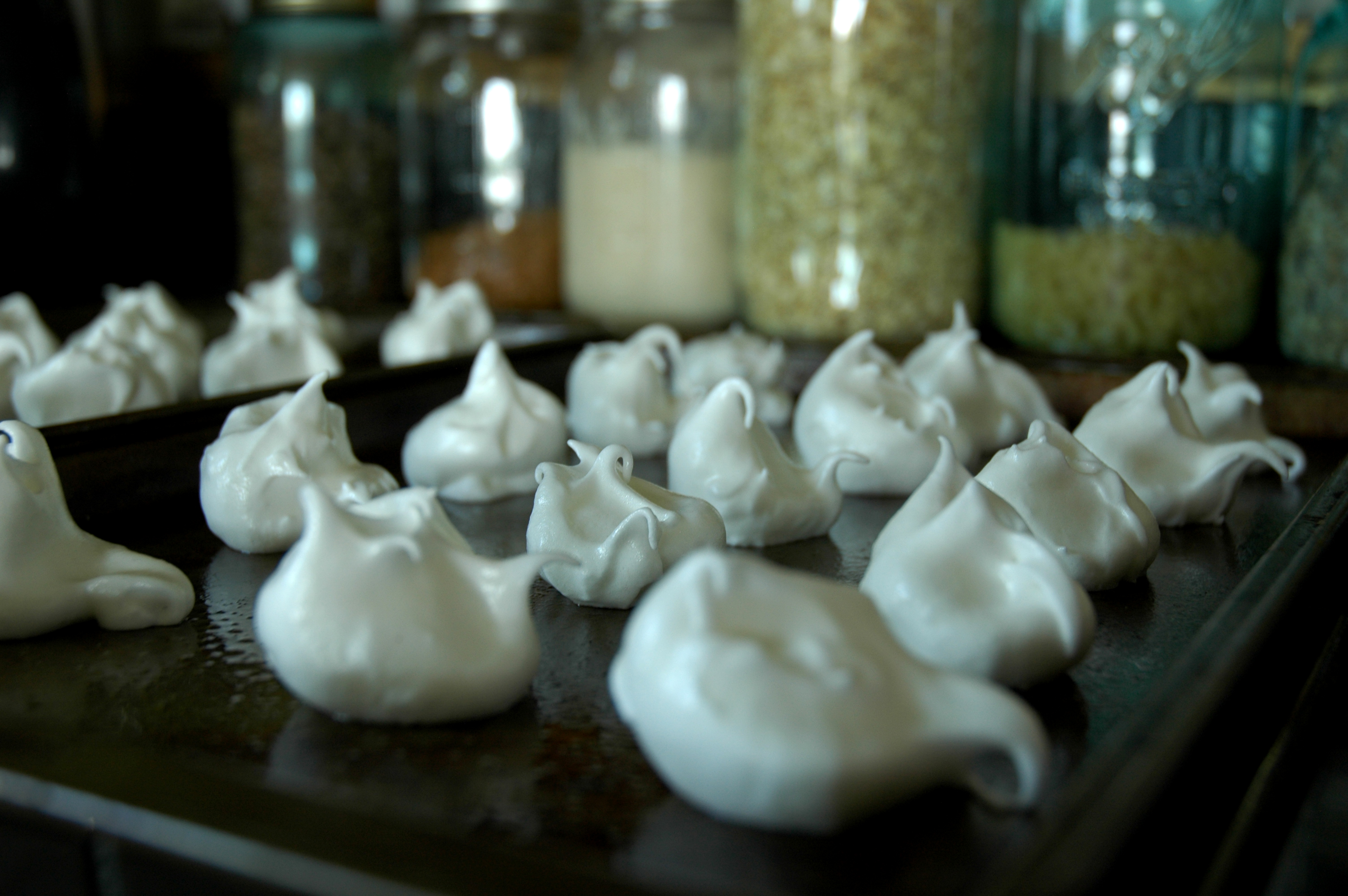 You are adding air. Now with a teaspoon and a twist to get that dear little peak, pop little meringues onto a buttered and floured baking (cookie) sheet.