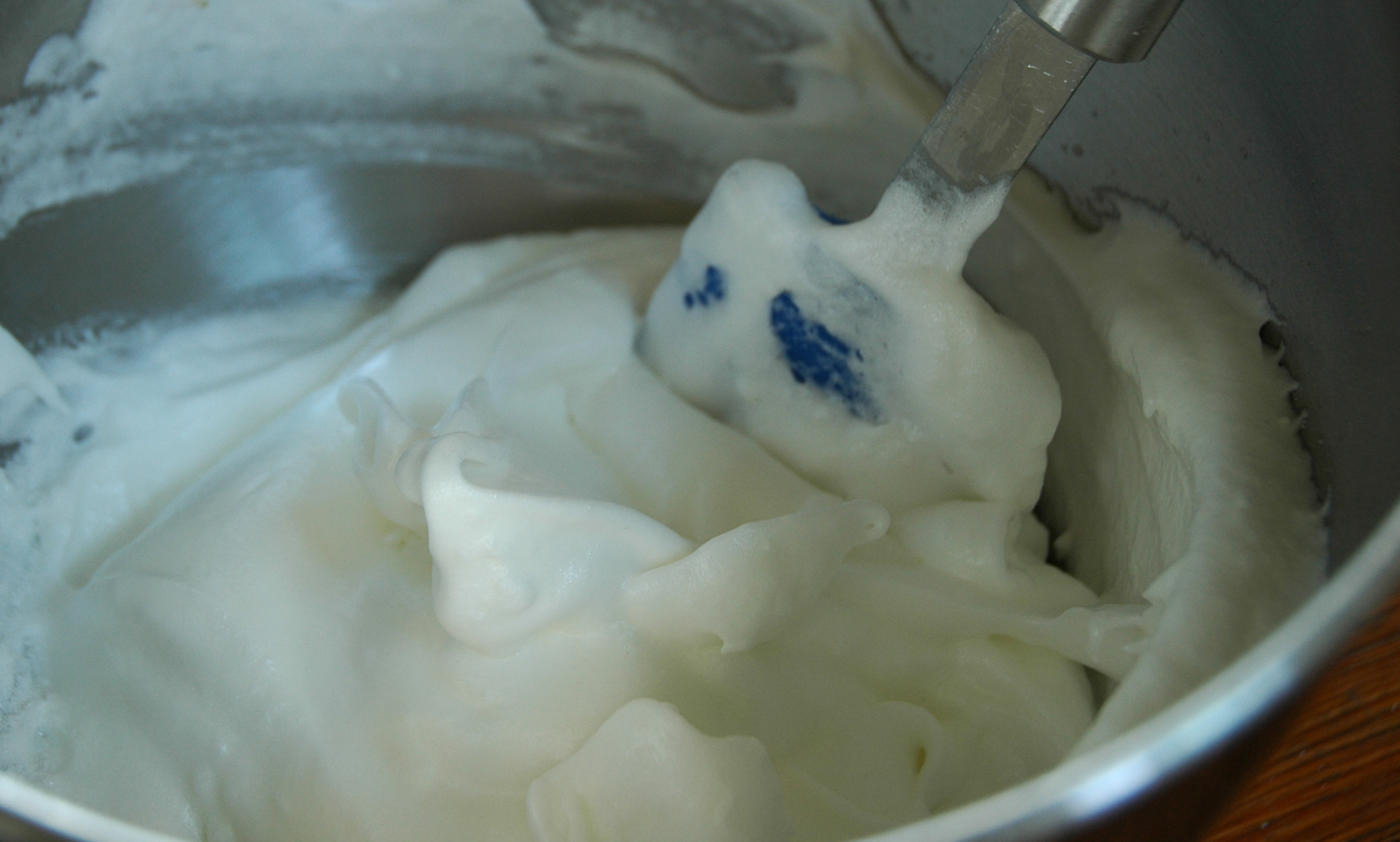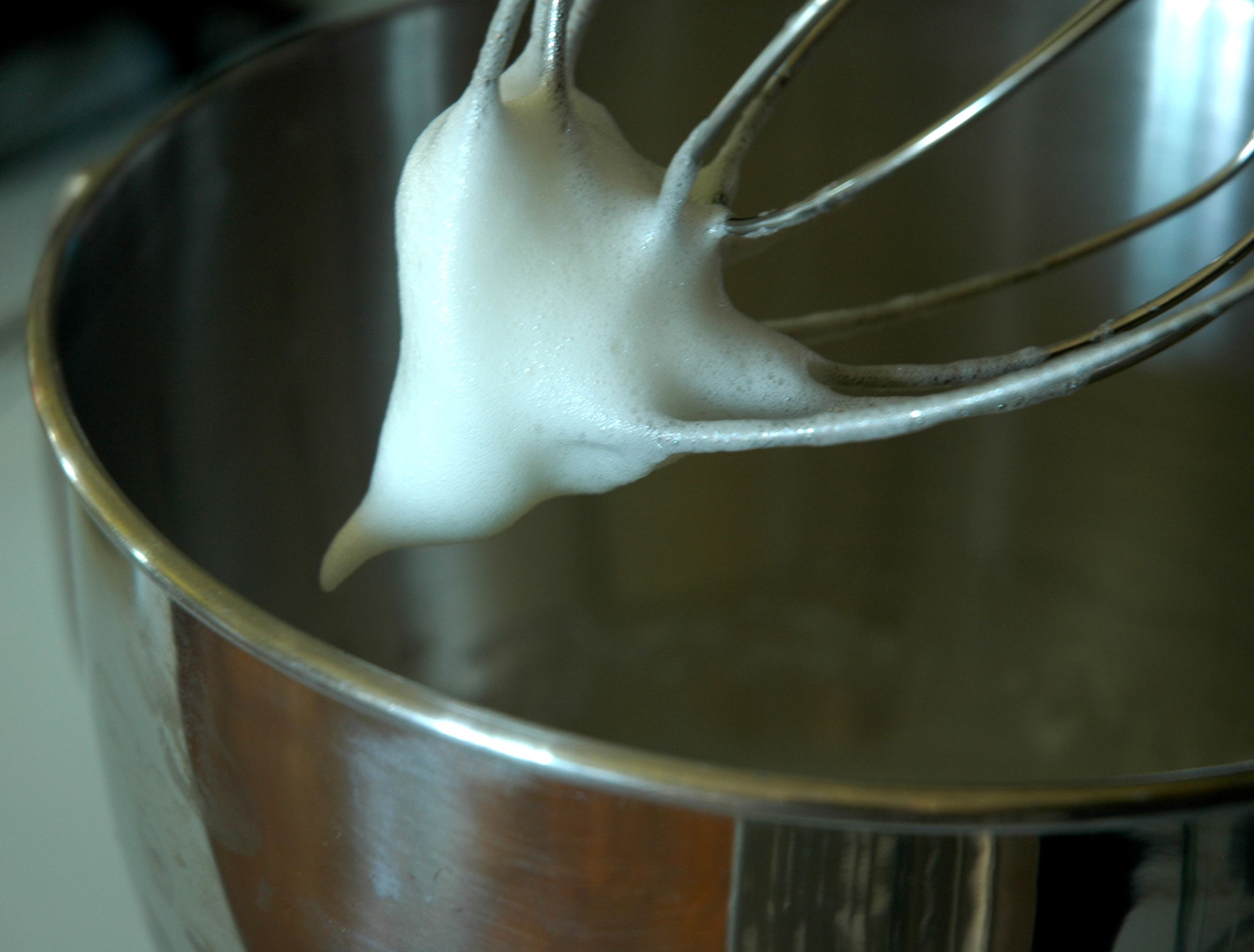 With beater still going strong – trickle the sugar in as slowly as you can, no – even slower than that – add half the sugar and beat until peaky. Mix the baking powder with the last of the sugar and slowly FOLD this in.