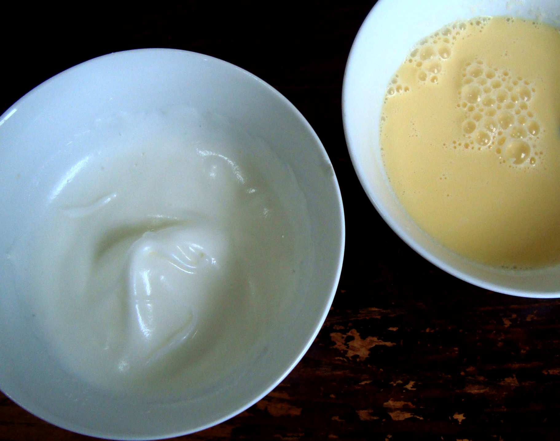 So, I had separated the 6 eggs, the yolks were mixed with three cups of milk and a teaspoon of vanilla in one bowl. I was beating the egg whites in another bowl into peaks slowly adding three spoons of sugar.