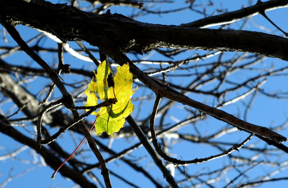 Caught betwixt and between.Yesterday I saw this leaf hanging way up high, hanging by a thread in a tree where it does not even belong.  Just visiting.  As I was shooting it lifted and simply blew away.