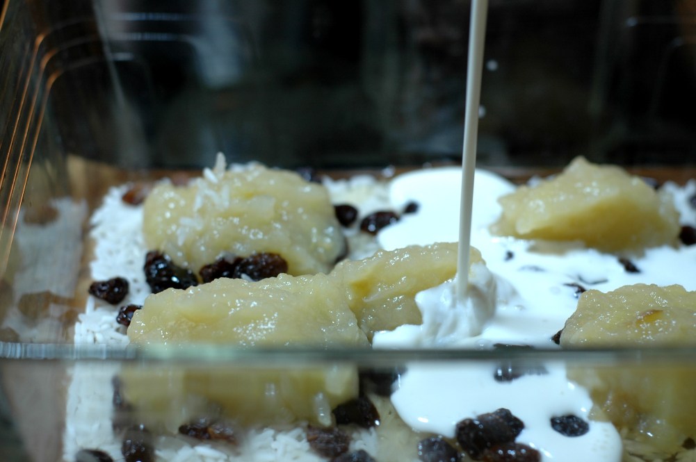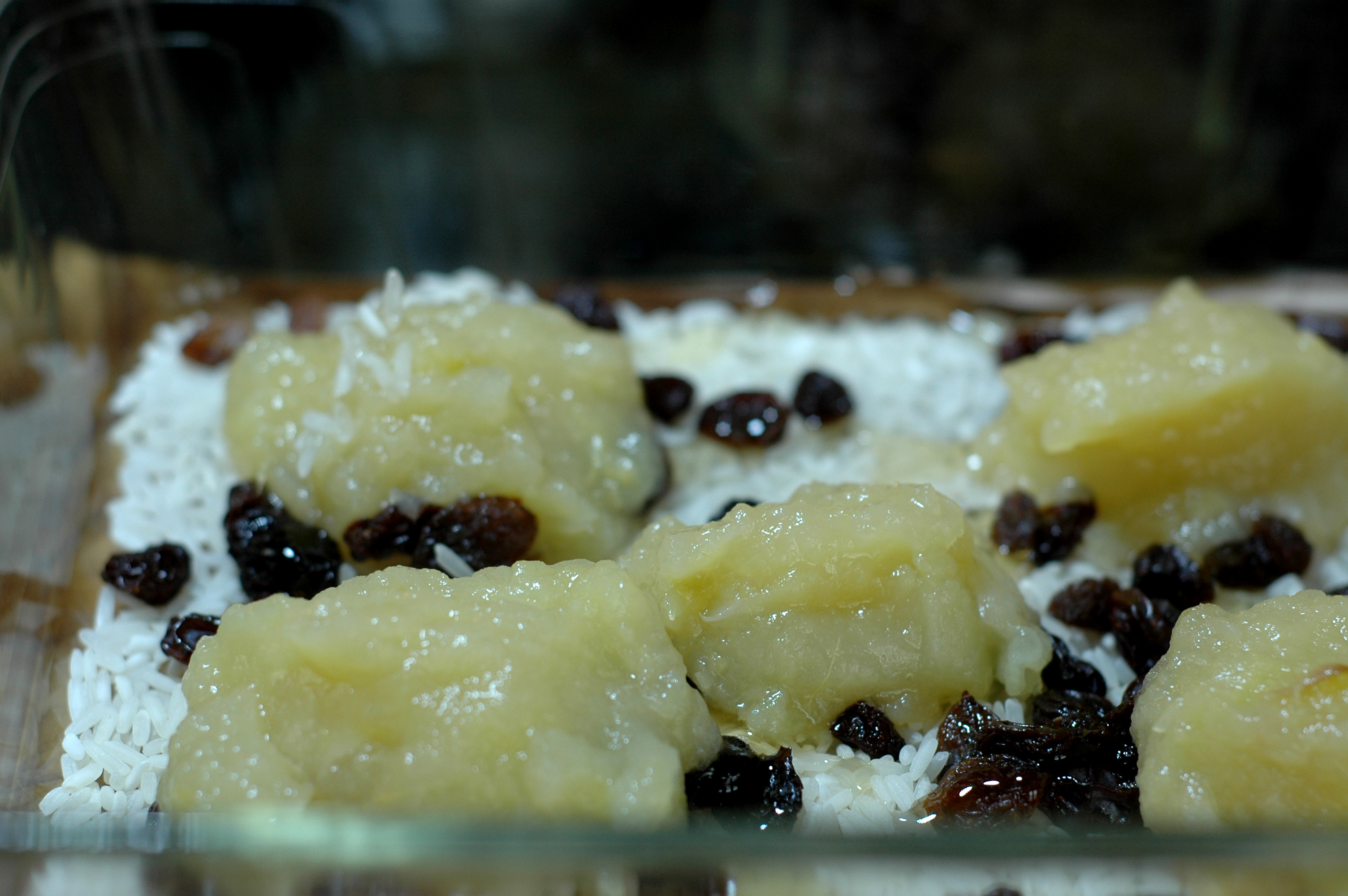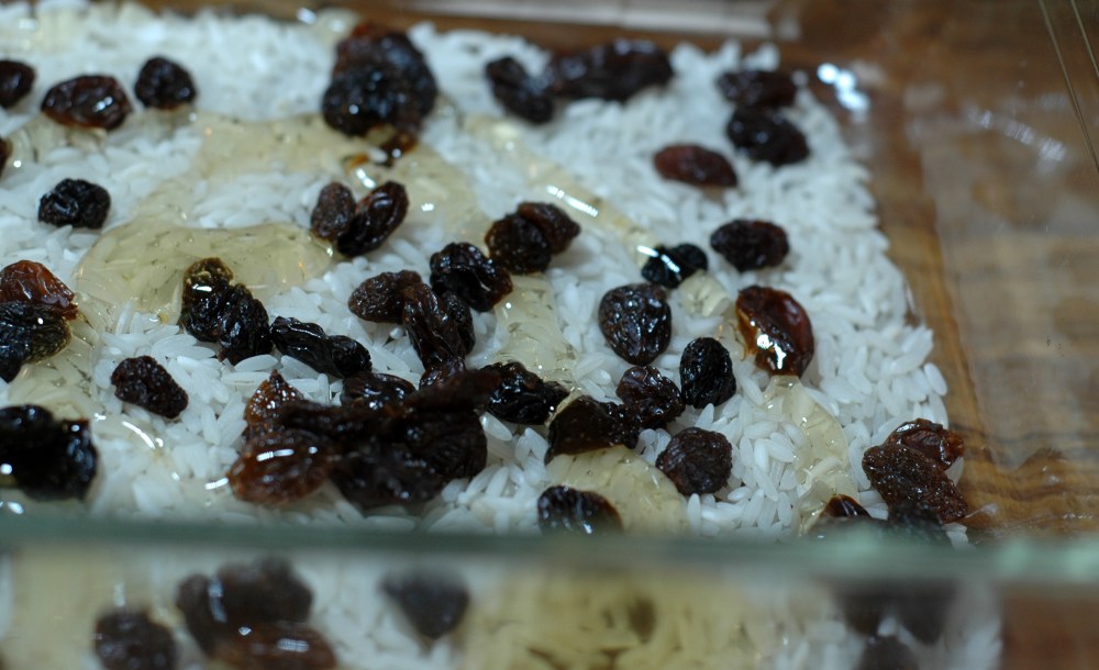 Cover the bottom of your dish with rice. Sprinkle over a tablespoon of sugar or honey, and a few sultanas. Half fill the dish with milk and cream, cook slowly in a moderate oven, for about 45 minutes. Be careful not to over cook as it will keep drying out after you have lifted it from the oven. (I added some home made apple sauce today).