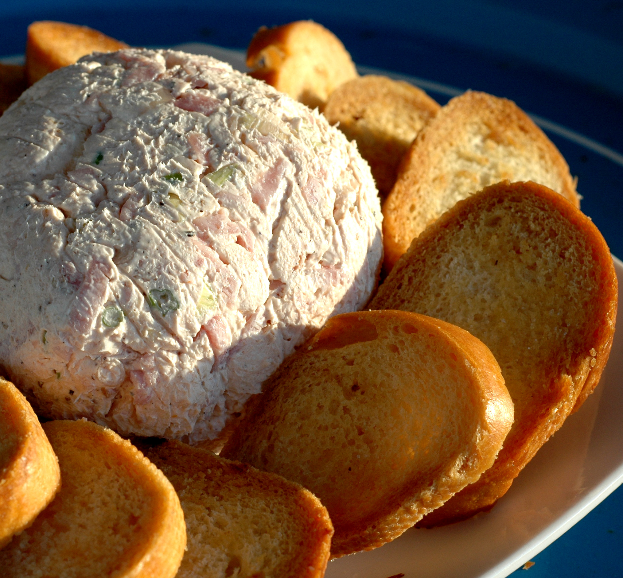 I serve this on crostini or some robust crackers, there is nothing worse than a disintegrating cracker. Now, we remember that the party rule is, small and simple to eat, so  pipe a little cheese ball mixture onto the tiny cracker or crostini and top with a tiny curl of chilled spring onion.