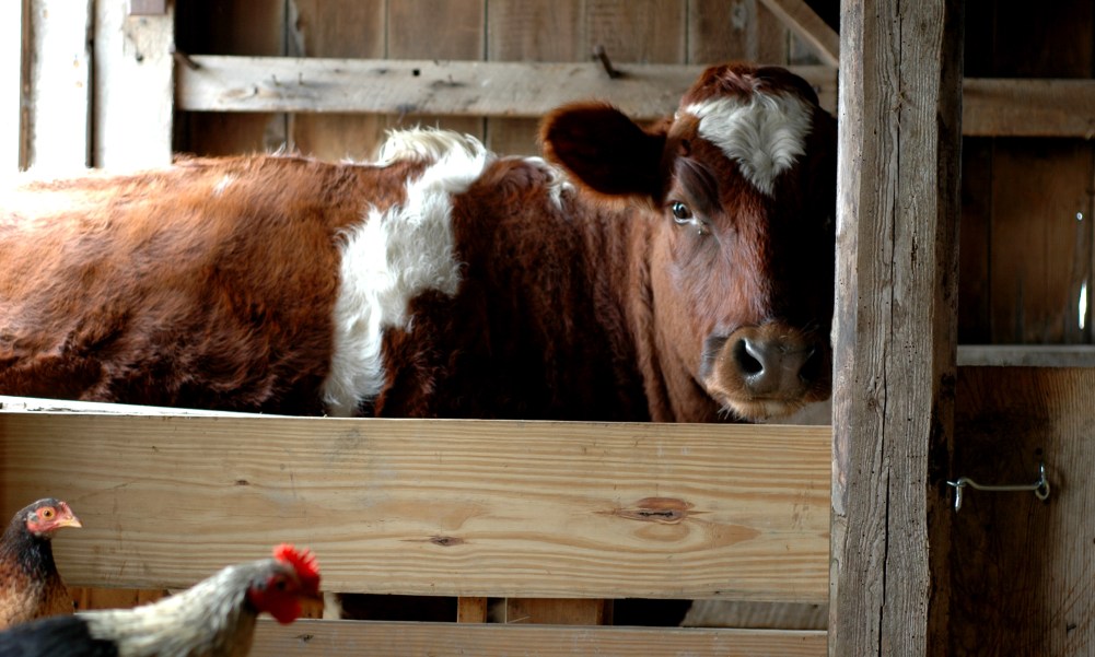 Behind Daisy is Queenie, my little Hereford Heifer.  She  will be the mother of my beef herd one day. She is about eight months old but I think she is a midget.   Herefords are low to the ground but sweet good Queenie is frankly the shortest cow I have ever seen. I have sheep bigger than her.  She is so tiny and so good natured.