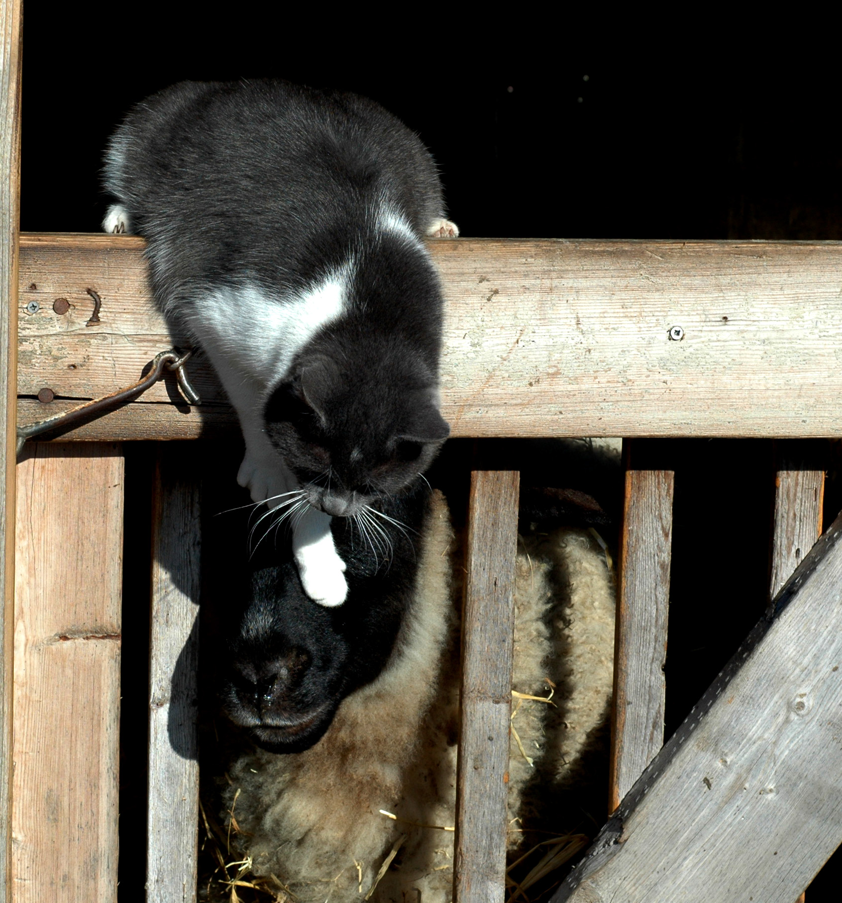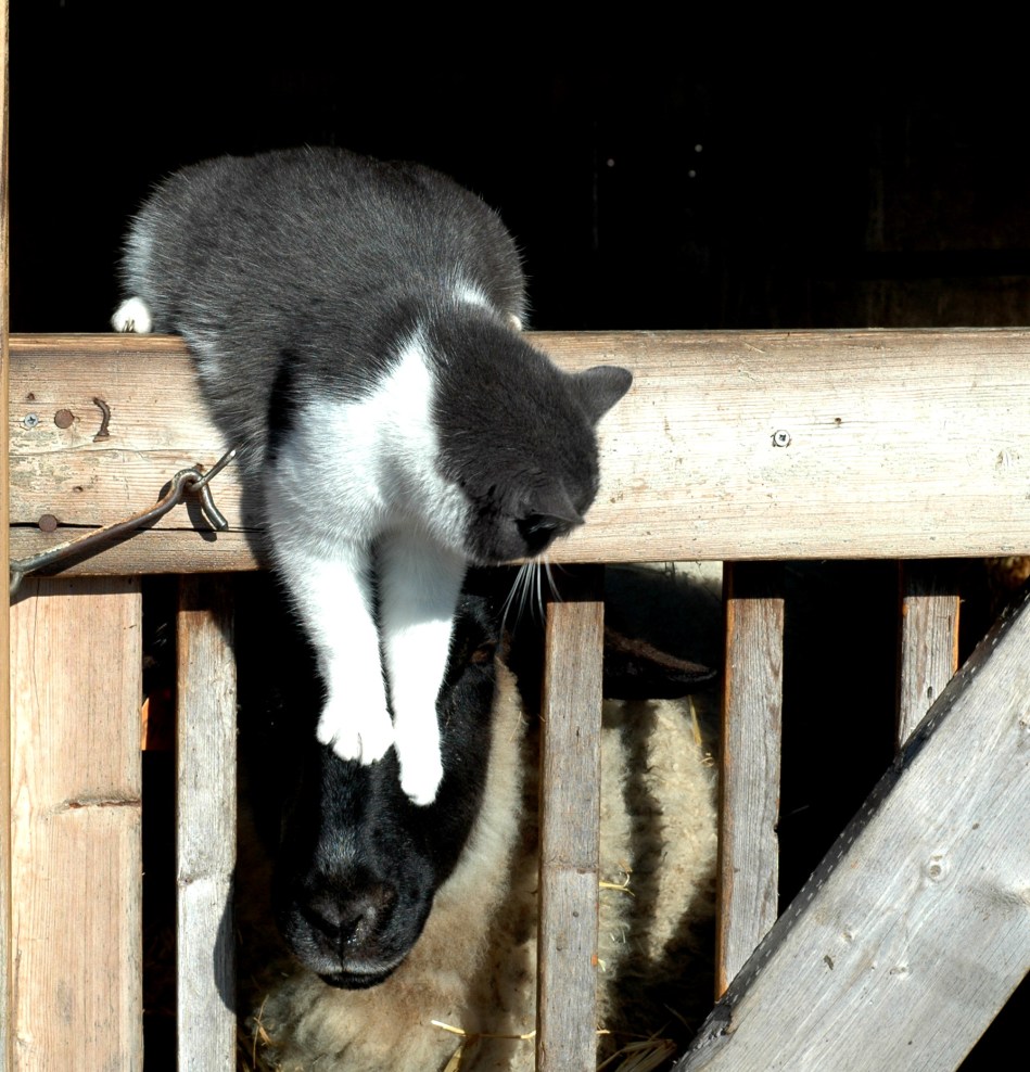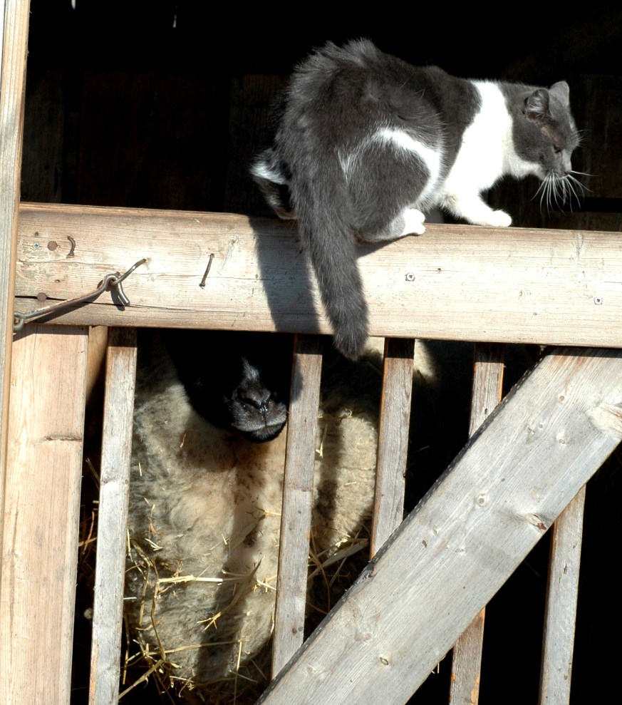 Thats my nose. Did I say to use my nose. I said NO Claws! Oh I give up, Fine barn cat you are. You can’t even break an old sheep out of her pen. Didn’t Daisy teach you anything! Run and get White Cat. At least he speaks sheep. No more I said. This is not a game!