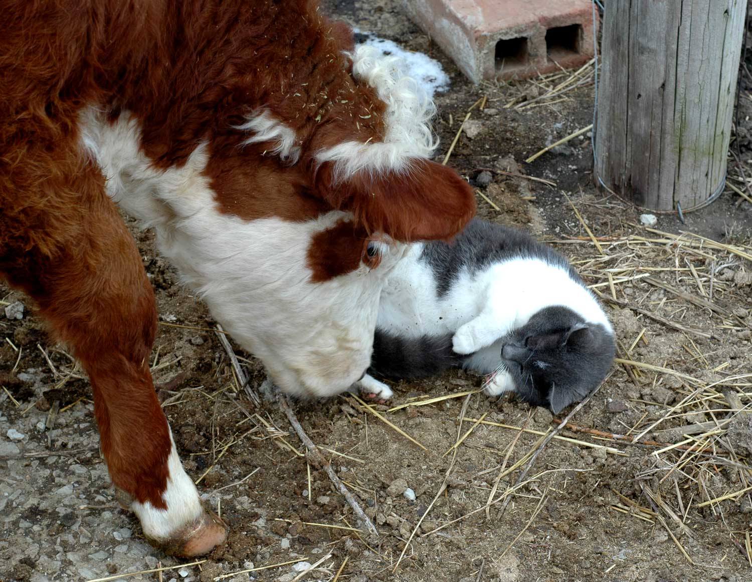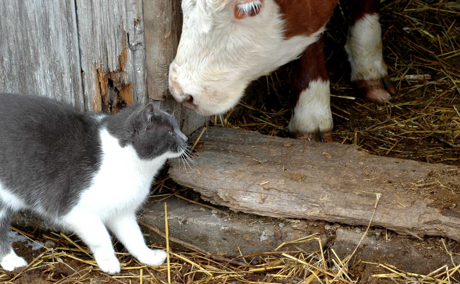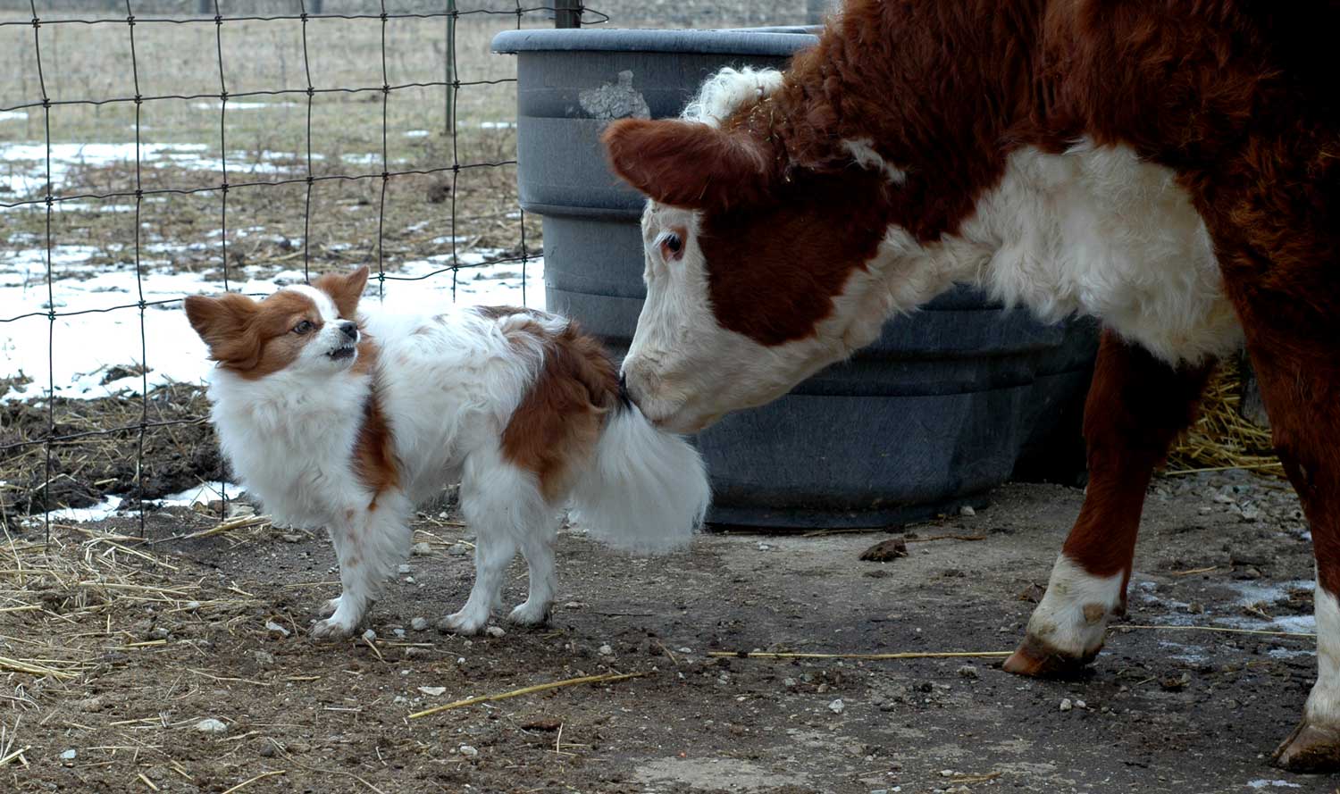 “Mia listen to your Mama. That is not a cat that is a dog. It is the Matriarchs dog. He visits sometimes. Be nice. And wipe that hay off your face. You are a mess!”