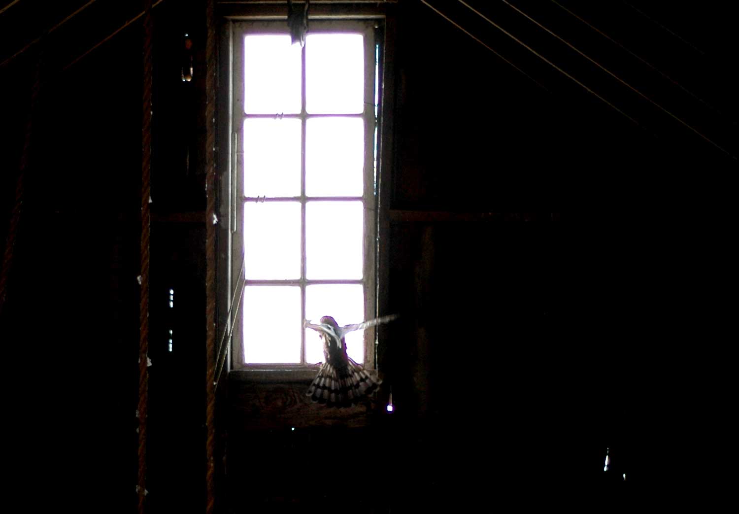 There is very little light up that high in the barn. I am sitting on a kind of cat walk very high up in the eaves.