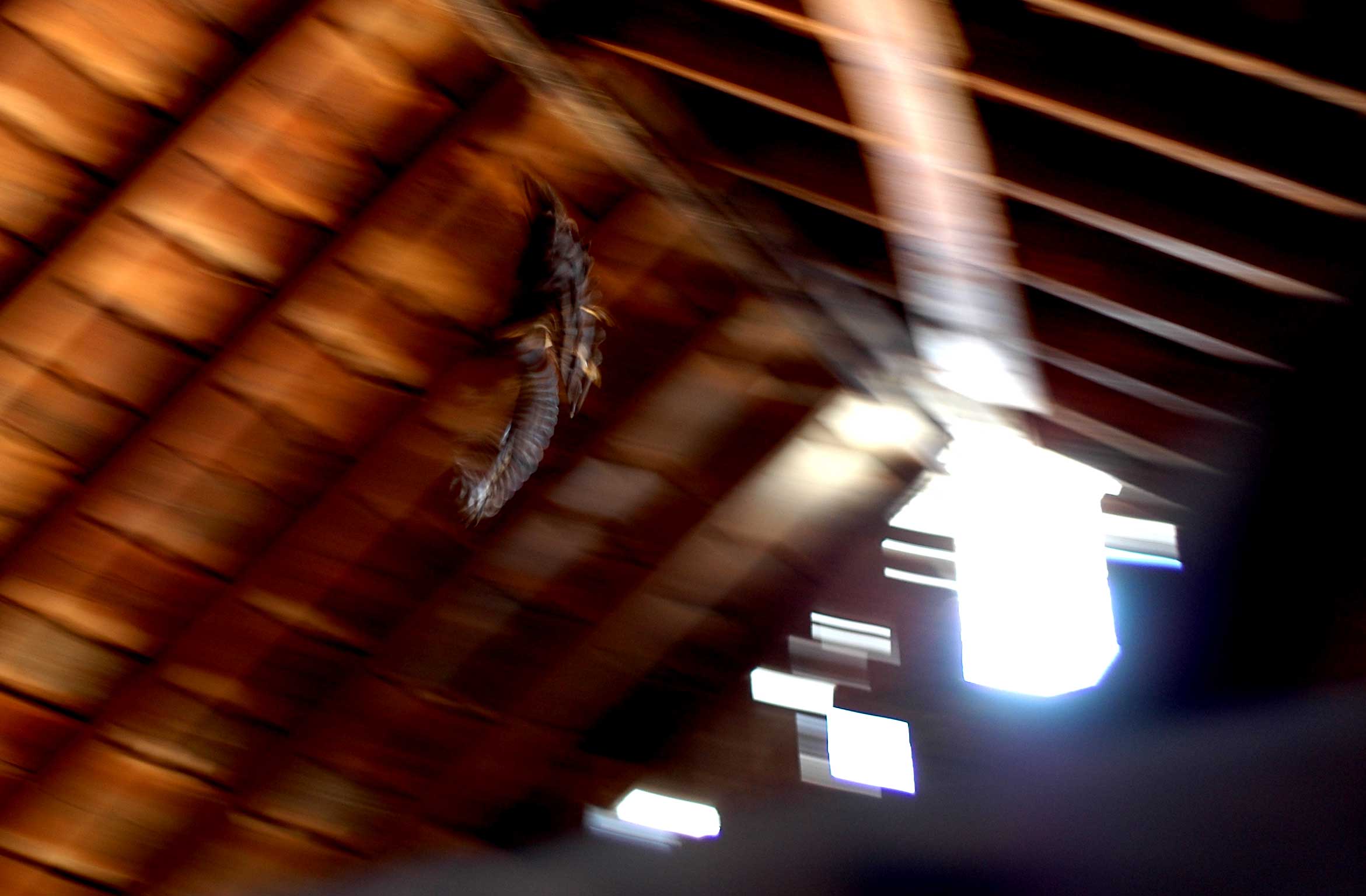 We had opened the big doors in the hope that he would fly out so we could get on with mucking out. He got quite frantic when we started to work in the barn yesterday so we had to abandon the floors until he vacates the premises.