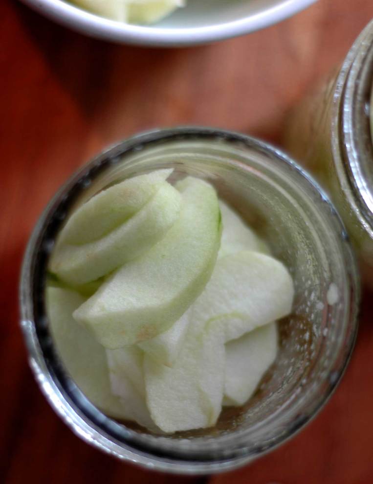 Grease your widemouthed jars  (this will work in a baking dish just as well).  Pack with sliced Granny Smith Apples (or any other tart apples) until the jars are about two thirds full.  Do not add sugar to your apples, leave the tart taste alone. Top with about 1/2 inch of the crumble. Sit your jars on a baking sheet in the oven for 45 minutes at 350F..  (about 160C I think.)  Be careful when you take them out of the oven. They are hot and awkward.  Don’t serve too hot.