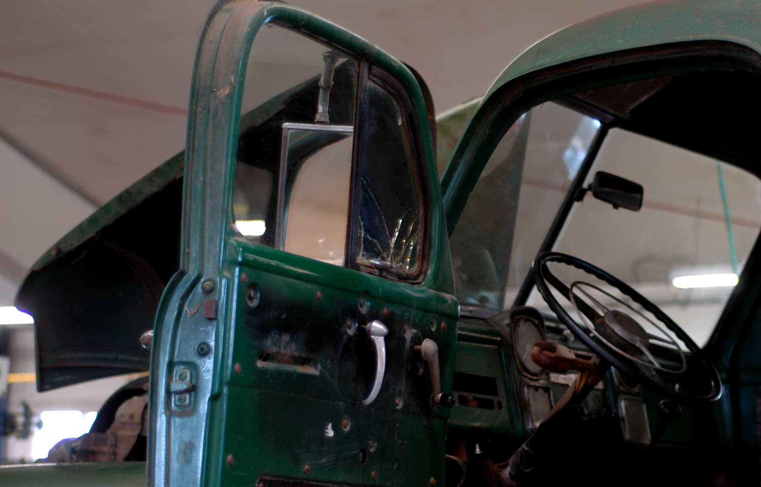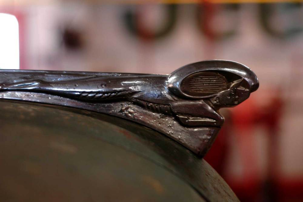 A horn! Seeing my excitement John leapt to the steering wheel and blasted me straight into the world of the deaf.   Then he produced the prize. A hood ornament.  He found this in his collection of stuff that resides in the workshop.