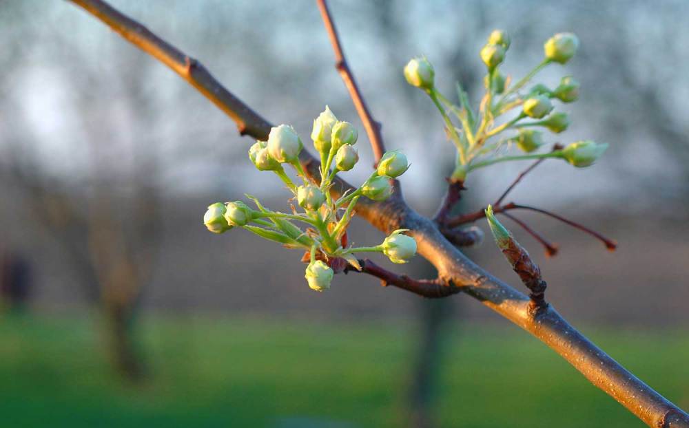 and there are three of these, flowering pears grow fast. The sun is up Daisy is yelling we must hurry. We also have five pear trees that are budding but not quite ready for pollination. The bees have a feast ahead of them.