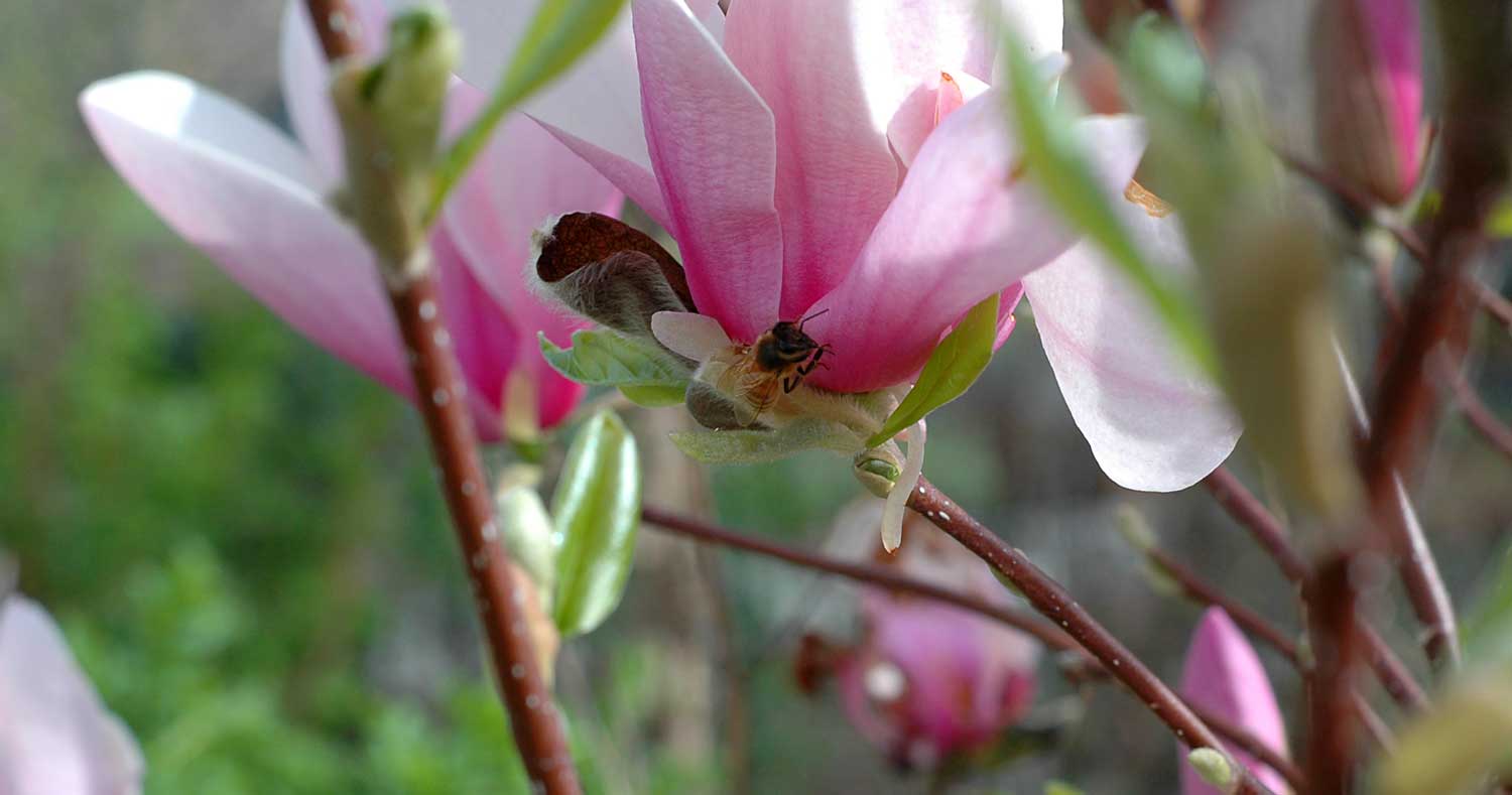 However before it rained the bees continued to work.  And look -a bee in the magnolia. This surprised me, I did not know that bees worked magnolias.  But as the Carpenter’s Lady  and I were admiring the flowers we noticed that the bees were literally climbing up the almost open petals, wriggling through the tiny gap and dropping down into the stamens. We stood and waited for ages but the bees did not come out!