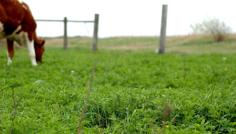 This is the most dangerous field on the property and the most nutritious. This is alfalfa.  I use this legume for fattening beef. Grass fed beef will not put on enough weight eating only grass, (grass fed is actually a misnomer) so we need to provide a mixture of good legumes and forbes (forbes is just a fancy word for weeds.. e.g. lambs quarters are forbes and they are very high in iron. I even put them in our salads with the dandelion leaves). Alfalfa is very high in protein.   So it is easy for an animal to bloat or get a runny bottom on alfalfa. But they grow beautifully and the dairy cows give rich creamy milk if it is properly managed. So I ration it to one hour in the late morning and one hour in the late afternoon, and padlock the gate so there are no break ins. Do not let them eat alfalfa when it is wet with dew or after a frost.