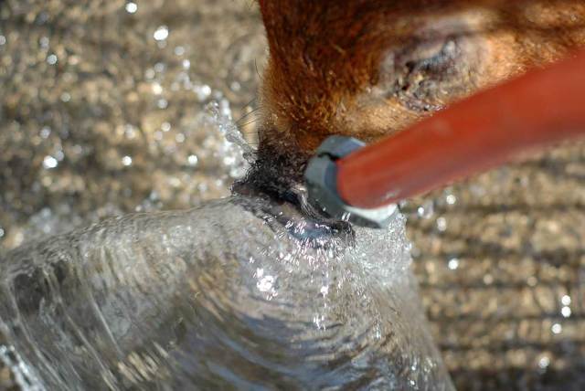 Water play. Hosing out the pigsty has already turned into a game of who can get the wettest!