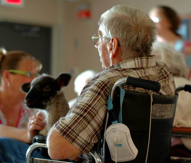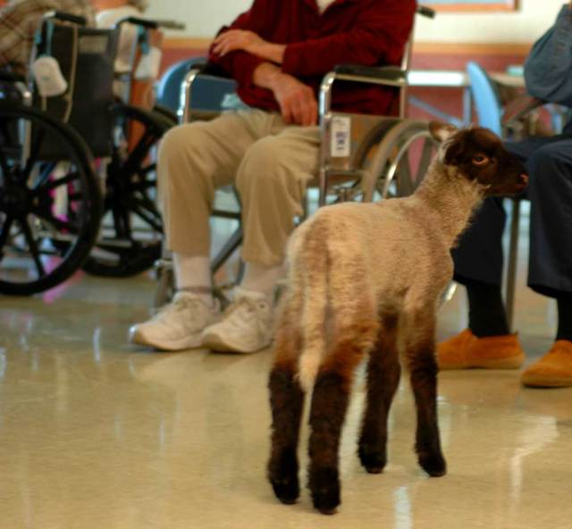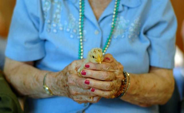 The worst part of our day was packing the animals and birds up and taking them away again. But we made an impromptu parade as we left, The Old Codger led in his wheelchair, piled high with chicks and boxes and babies bottles, barely able to see where he was going. And we all trundled along behind him lugging animals and assorted paraphernalia. Wonderful staff helping. Laughing our way back out to the front door, with voices calling out to the animals as we went. And they want us back. Soon.