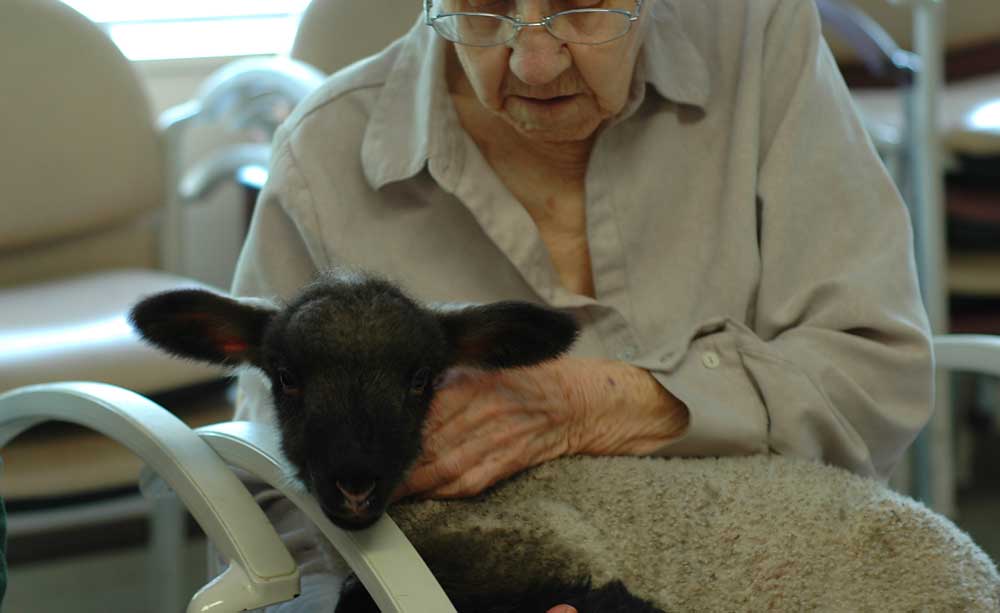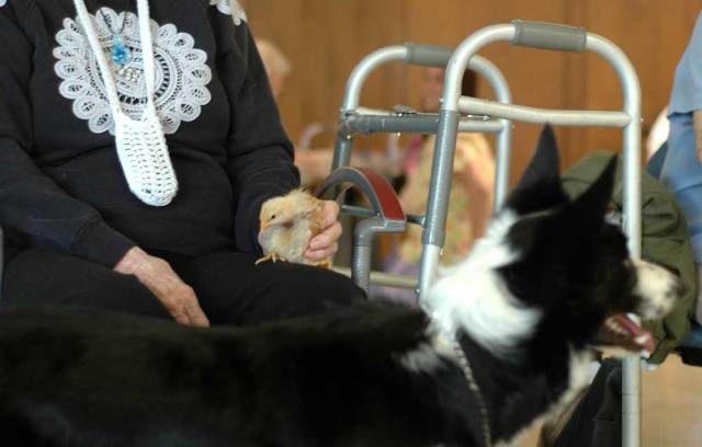 As the chickens did the rounds, Minty followed me around and around the room sniffing and visiting. Being petted and cooed over. But soon she got tired. And I lifted her into the laps of the residents for a rest.
