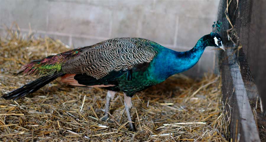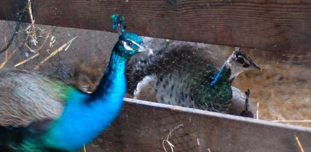 On our return from the Bantam Swap, I placed the cage, with Kupa’s surprise, into the still empty turkey enclosure and left the cage door open while closing the pen door.  This was so Kupa could see but not touch for a wee while. I had no idea how peacocks behave with strangers.