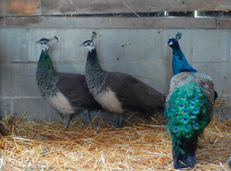 All afternoon they gently flowed about the large enclosure like  a tiny school of fish. When Kupa moved left, they moved left, when he settled down so did they,  when he flew to the roost they clumsily followed.  Kupa is happiness filled.  He will have to stay in there with them for a few days until they settle down and learn the peacock call. Which by the way is Neil Neil!! Thank you darling.  When I call Neil Neil, Kupa appears and hops up to his feeding ledge, which luckily is IN the turkey enclosure. The girls will learn this too. Then he can lead them out and show them about. But not today.