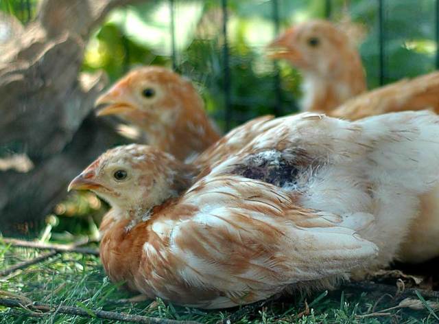 And here is our wee Stinky the Second. The chick recovering from a hawk attack. She has these two massive wounds on either side of her body but they have dried up and no longer smell. Yesterday I let her back in with her sisters. And they accepted her without fuss. Her ability to get about is improving too. There are plans afoot to make a mobile run for them. So they are hanging out in a makeshift run on the lawn.