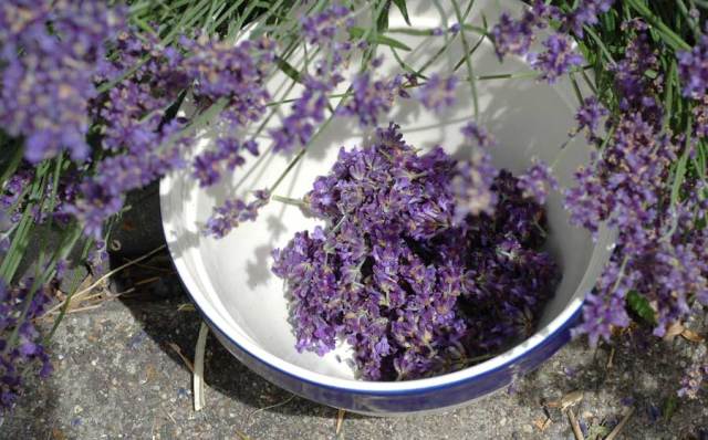 I harvested some lavender flowers though not too many. It is a dangerous business picking lavender with the bushes full of bees.  The best time to harvest lavender is early morning when the bees are still sleeping and the buds are high in oil.  I should have remembered.