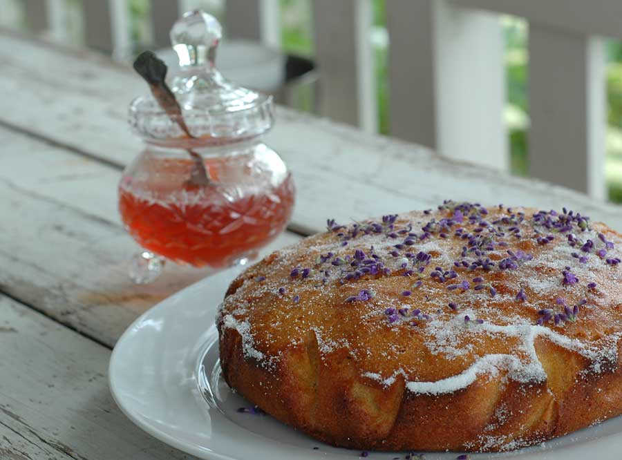 After it is baked and while it is still piping hot, squeeze the juice from the other lemon on top, sprinkle with sugar and fresh lavender buds.