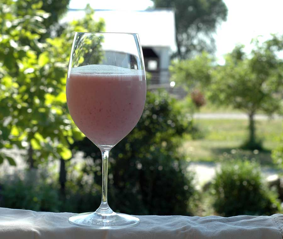 So I figured I would go the whole hog last night and  make myself a special Friday night drink with cold milk. A milky cocktail.  . Homemade yoghurt, fresh milk, farm honey, ice, local strawberries and brandy.  Blend. I was thirsty and hot so I poured it into a big red wine glass.   It needs a name.
