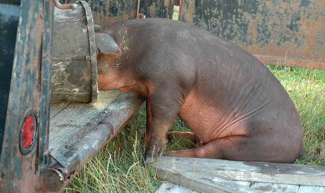 This red pig was too fat to get up this tiny step, but he was just so hungry. I should not laugh but really this is an amusing shot. Since then, I have made him a new step by piling three old barn doors one on top of each other so he can get into the trailer and eat standing up. Like a good pig.