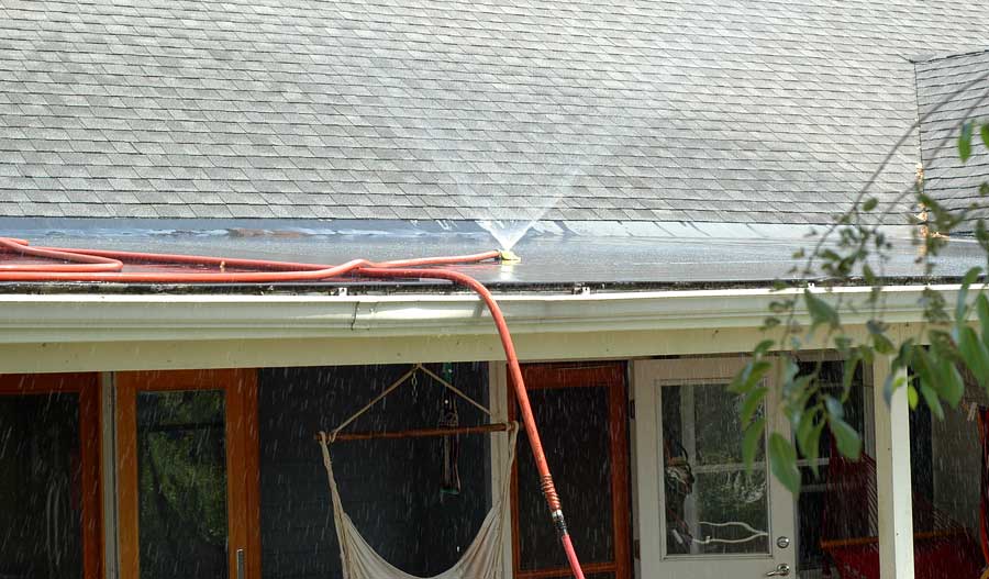 We were very naughty yesterday and put the sprinkler on the roof to make some cool pretend rain.  And to test my theory that it would cool the house.