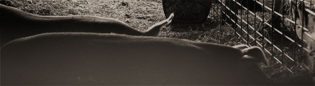 The Shush Sisters have a night time residence in the barn. It has big inside sleeping quarters, that can be closed right up for the winter, and an outside concrete courtyard. In the morning they lie ever so quietly as I feed the other barn animals and birds and milk Daisy the cow.