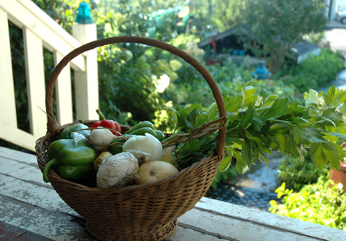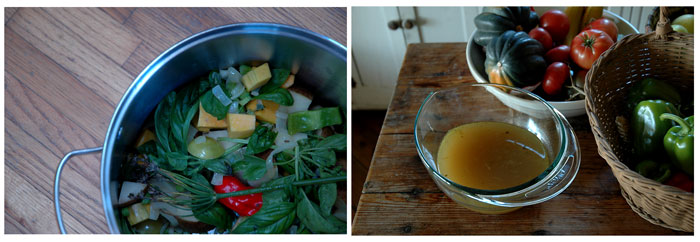 Like the summer sauce I make the stocks with whatever I find in the garden that day. You can even make stock using the clean vegetable peelings from your dinner preparation. I often save the water I pour off the peas, beans, cauliflower or potatoes and freeze it to add to a stock later on. Just label well.