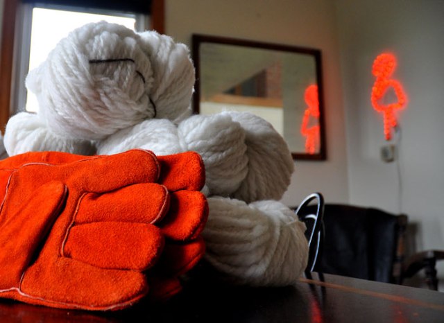 Just by commenting on her site one day I won these spectacular orange Welding Gloves. Maybe I will take up welding again. Or use them as oven mitts. Thank you so much Celia. These are brilliant. And also, look at Mama’s wool. Spun by Sara at Punkins Patch. Finally home, awaiting my crochet hook and the heads of little babies. In all my life I never imagined I would find such joy and so many good people in the Weblog World.