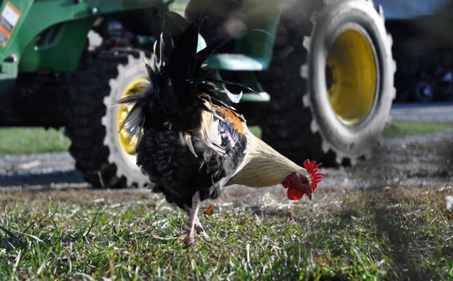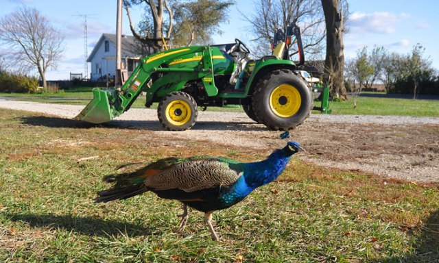 A peacock in the foreground of a photo with heavy duty farm equipment! Now that’s a photo that should be an advertisement for tractors! I love it! That is probably not a tractor, though, is it! I plead ignorance! 🙂