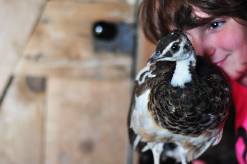 Here is the girl (our cadet) and her peahen – Geraldine. Geraldine is such an angel of a bird. I called to her and up she came and rushed across, I told The Cadet to sit on the hay bale step that Geraldine likes and this little bird, as sweet as can be, literally flew down from the top hay bales to the lap of this child then settled into her hands and sighed with relief.