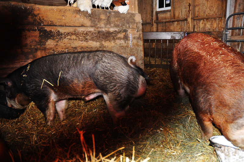 I think that the breeders who have the most success are patient. Just patient. And when the girl runs away they open the gate and let her out. When they have read the signs rightly and she stands for the boar they let nature take its course. Artificial Insemination is a good option but not sustainable for me, and my wee farm has to sustain itself without buying semen in a plastic bag from the outside. (Though keep in mind that we will sell or swap boars every few years). So I bought a boar. Also I think I am lucky to have a gentle, well bred boar who was well treated right from the beginning – this has resulted in a confident, kind animal.