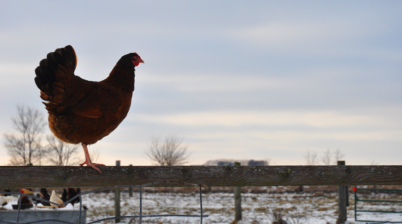 As a rule the chooks do not like the snow. (In New Zealand and Australia we call chickens: chooks and as I am a New Zealander living in America these little words from home are a comfort so bear with me). My chooks are free range so they can go outside and get lots of sunlight in the daytime but the pigs Tima and Tane are also free range. So to make sure the pigs do not eat the chicken’s food I feed the chickens on top of the piglets hut as a raised feeding table out in the field. Also this encourages them to come out into the daylight to eat.
