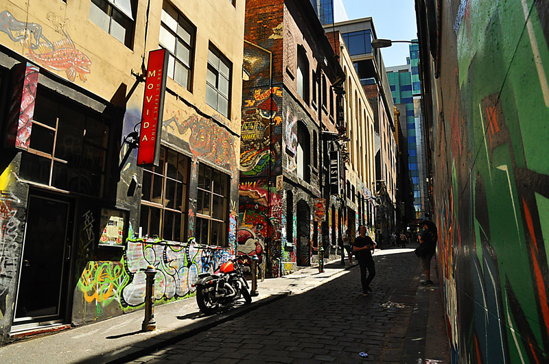Downtown graffiti like Hosier Lane is vibrant and joyous. When graffiti is encouraged as an art-form it loses its bitter shallow defiance and becomes brilliant and full and wonderfully complicated. Hosier Lane is one of a couple of lanes in Downtown Melbourne given over entirely to graffiti artists.