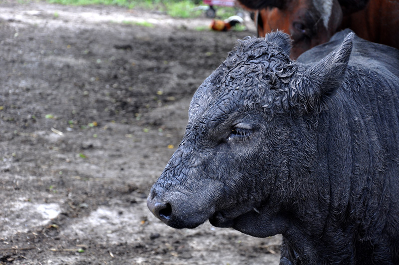 So, I took my naughty filthy milking cows and the little bull, who is following Lady Astor around, up to the concrete pad to hose them down, from the feet up. Both their udders were caked in mud.