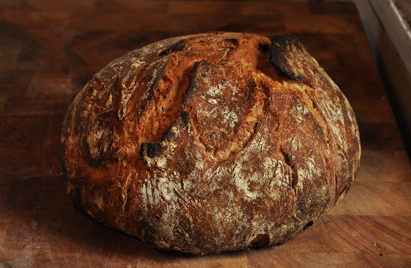 ( This bread is baked in a cast iron Dutch Oven, if you do not have one, a ceramic bowl with a lid would do. I know of a lady who bakes her bread in enamel tins with lids, though my bread tutor was skeptical. (But her bread is wonderful!). The Dutch Oven is not terribly expensive, I have two and they are in constant use.)