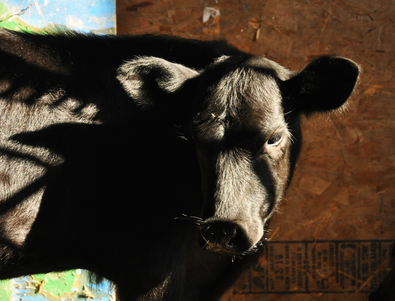 Meet Tia and her cousin BobbyT3. Tia is the daughter of a major star in the Holstein Show Circuit.  And her father is an acclaimed Angus bull. She is very calm, and friendly. Docile. Her cousin the steer is also a gentle fellow. They are both a good size too. Almost three months old. Nice looking animals.