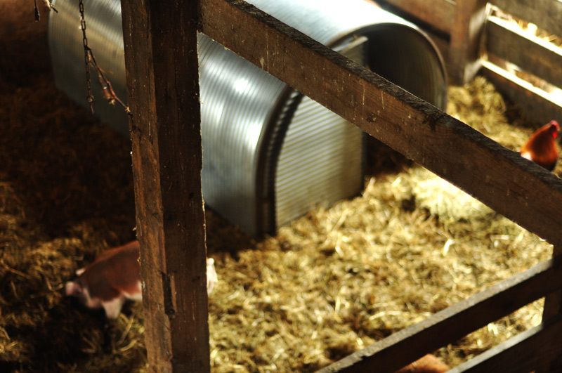 Yesterday I took out the piglets blue plastic fish tank house, they are getting too big for it now. I gave it back to Tima and Tane. (Who refused to sleep in it because it smelt funny). Then, with the tractor, John brought one of the tin huts up from the field and to the door of the barn and I very, very slowly dragged it right around the barn and into the center of the pigs area. Into the piglets open plan bedroom.