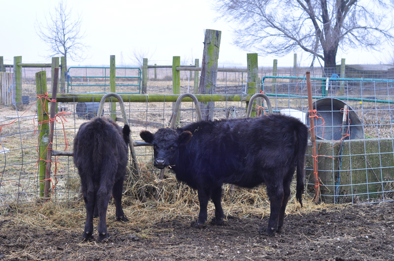Here is a better shot of the calves feeding gate. Txiki (on the right) takes after her Dexter mother – she is a very sturdy little heifer. These Angus/Holstein calves have already caught up with her.