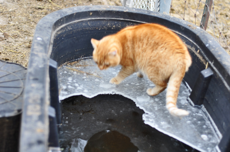 Yesterday afternoon I saw That Cat perched precariously on a sheet of ice leaning down to the water below for a drink.  I need to add here that there I plenty of other vessels of heated water in the barn for cats and birds.  Why she chose this trough I don’t know.  Camera House was not quite focussed  when this happened. Watch this sequence.