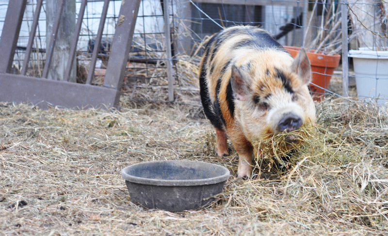 I was sitting next to Sheila yesterday afternoon as she napped in her enormous bed. She grunts when I sit down, then grunts again when I lean on her as though she were an enormous firm slightly prickly cushion. She went to sleep. I marveled at her breathing for a while,  her eyes closed and her breathing slow.  She uses all the space in her lungs when she is resting, her breaths deep and long and strong. I checked the messages on my phone for a while – my legs stretched out, boots crossed at the ankles. Sitting in that dry warm space with my breathing cushion behind me. Later I slid down further cuddling into my pig and wondered about things, my fork leaning on the barn wall untended. The dogs chose corners. Tia the heifer calf, perky and well again came in  to the barn at one point and observed us for a while, chewing her cud.