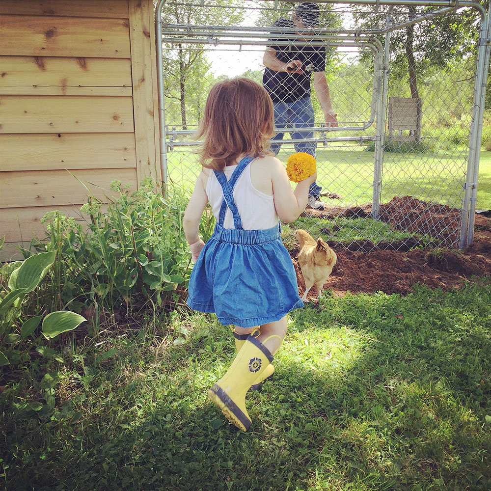 We got our first chicks in May of 2015 — M was a year and a half old at the time.  She’s a sucker for cute things (I have NO idea where she gets that), and we loved having our little peeps in the house for the first several weeks.  Eventually, they moved out to the small coop my dad and I built that summer, although now they live in a much bigger coop we built inside the pole barn.  M has always adored the chickens and has quite a way with them.  The more skittish of the hens won’t let me get near them, but M can just lie in the grass, chatting away, while they all lounge with her.