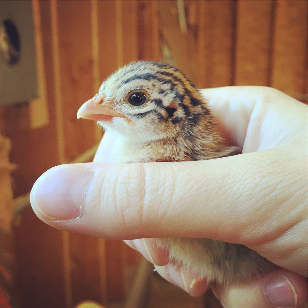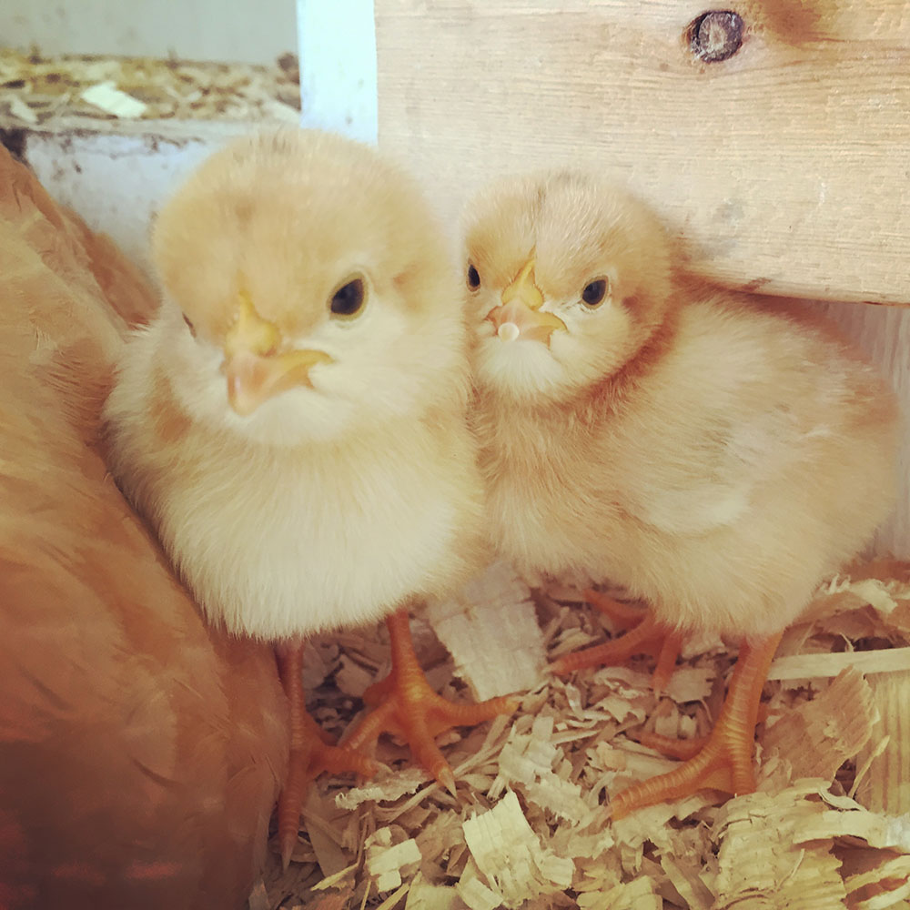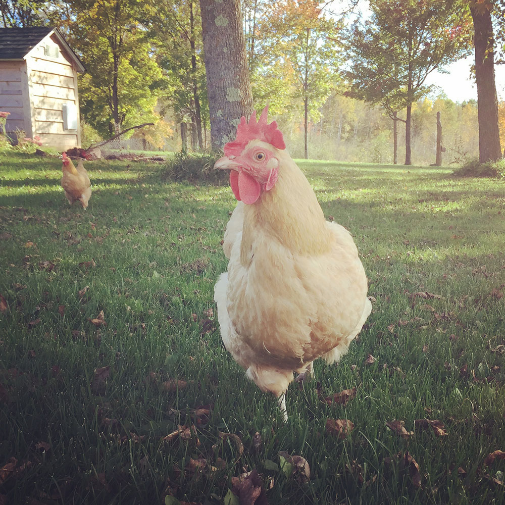 Over the past year, we’ve had multiple chicken births and deaths.  I added a rooster, Mister Chicken, to the flock at the very end of 2015, and when my hens, being Buff Orpgintons, a breed prone to broodiness, decided they wanted to hatch some eggs this summer, I let them.  Rita hatched two little fluffs in May, and Aster hatched another two chicks — plus six adopted guinea fowl for our neighbors — in July.
