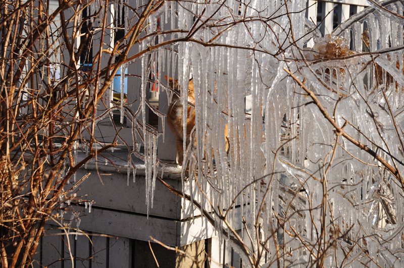 • No, sorry, it’s me, Albert,. Also wanted to say that the photos today held my attention, especially the branches dripping icicles and the fresh carrots laid out in the snow. But I kept returning to Boo lying on your shoe– a message (“you’re not going out there without me.”